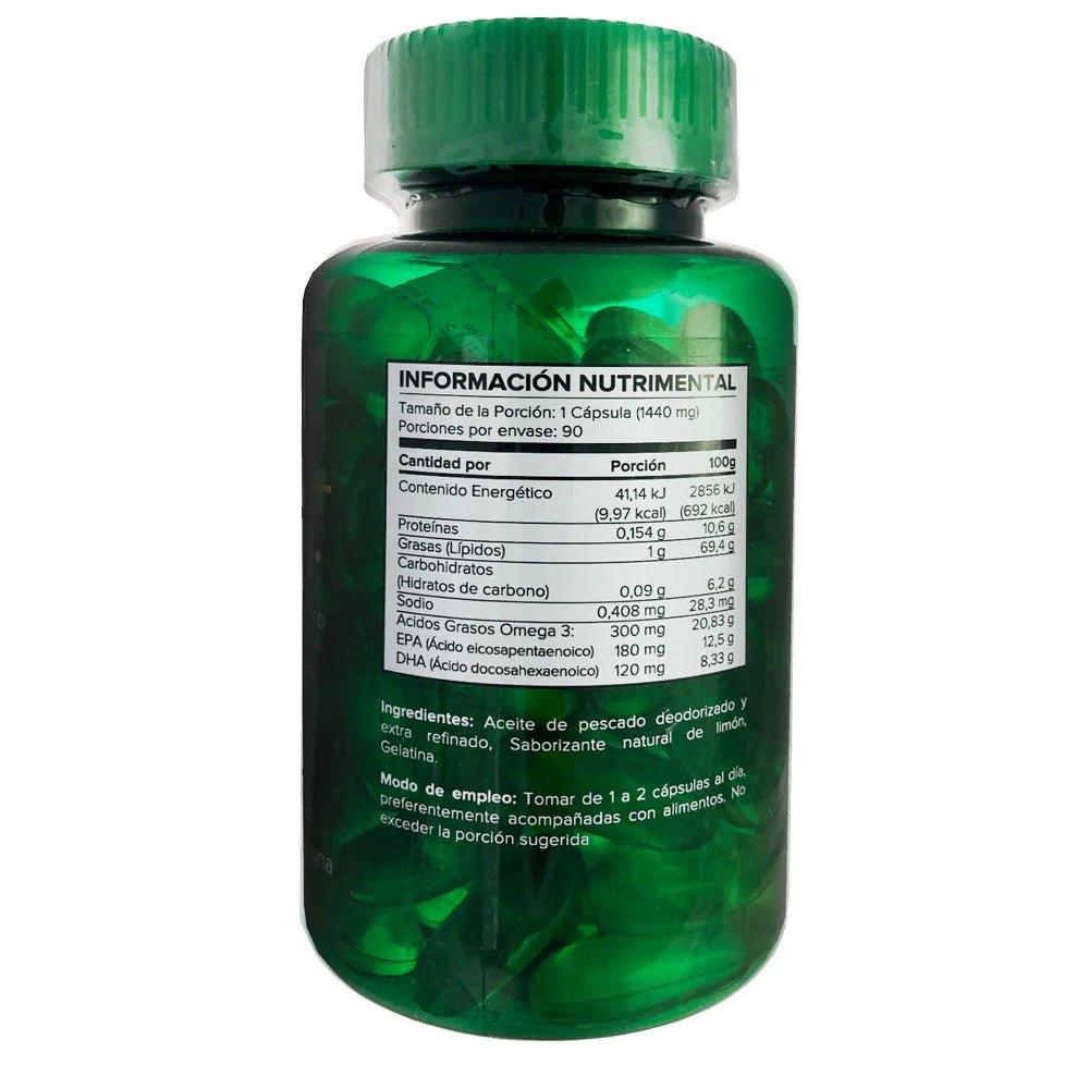 Producto elaborado en México. Cada frasco contiene 90 cápsulas de 1440 mg.