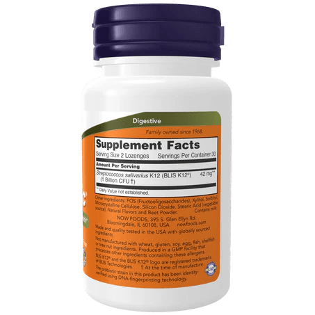 OralBiotic de NOW es un suplemento en pastillas bucales con la cepa probiótica Streptococcus salivarius K12. Apoya la salud oral y de garganta, favorece un aliento fresco y contribuye al equilibrio de la microbiota bucal.