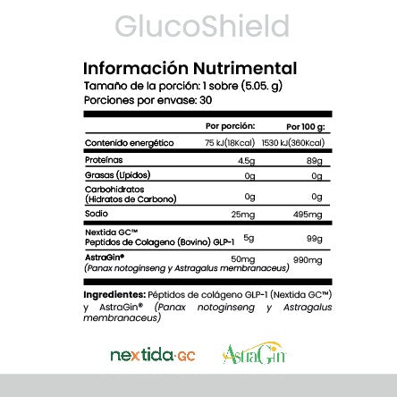 GlucoShield es un suplemento en polvo que combina péptidos de colágeno GLP-1 Nextida GC™ con AstraGin® para apoyar la salud articular, la elasticidad de la piel y la recuperación muscular. Es libre de lácteos, soya y gluten, con colágeno proveniente de ganado grass-fed.