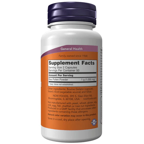 Bee Pollen Caps de NOW Foods es un suplemento de polen de abeja en polvo, una fuente natural de nutrientes esenciales, enzimas y antioxidantes. Aporta 1,000 mg por porción, ideal para quienes buscan fortalecer su energía diaria y apoyar su vitalidad general**. Fabricado bajo estándares de calidad y libre de OGM.