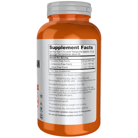 BCAA Powder de NOW Sports combina leucina, isoleucina y valina en polvo puro para apoyar la recuperación muscular y la síntesis de proteínas tras el entrenamiento. Ideal para deportistas y personas activas.
