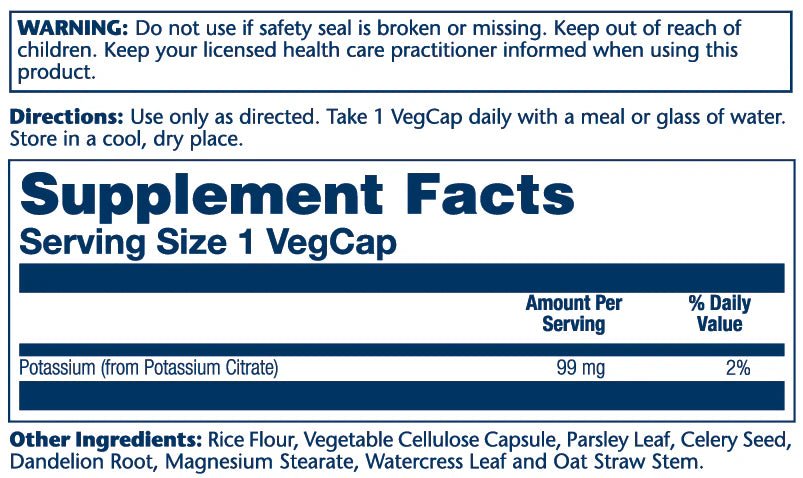 Potassium+ de Solaray es un suplemento formulado con 99 mg de potasio obtenido de un complejo de aminoácidos, junto con extractos naturales de manzanilla, berro y perejil. Esta fórmula vegana ayuda a mantener el equilibrio electrolítico y apoya el buen funcionamiento muscular, celular y cardiovascular.