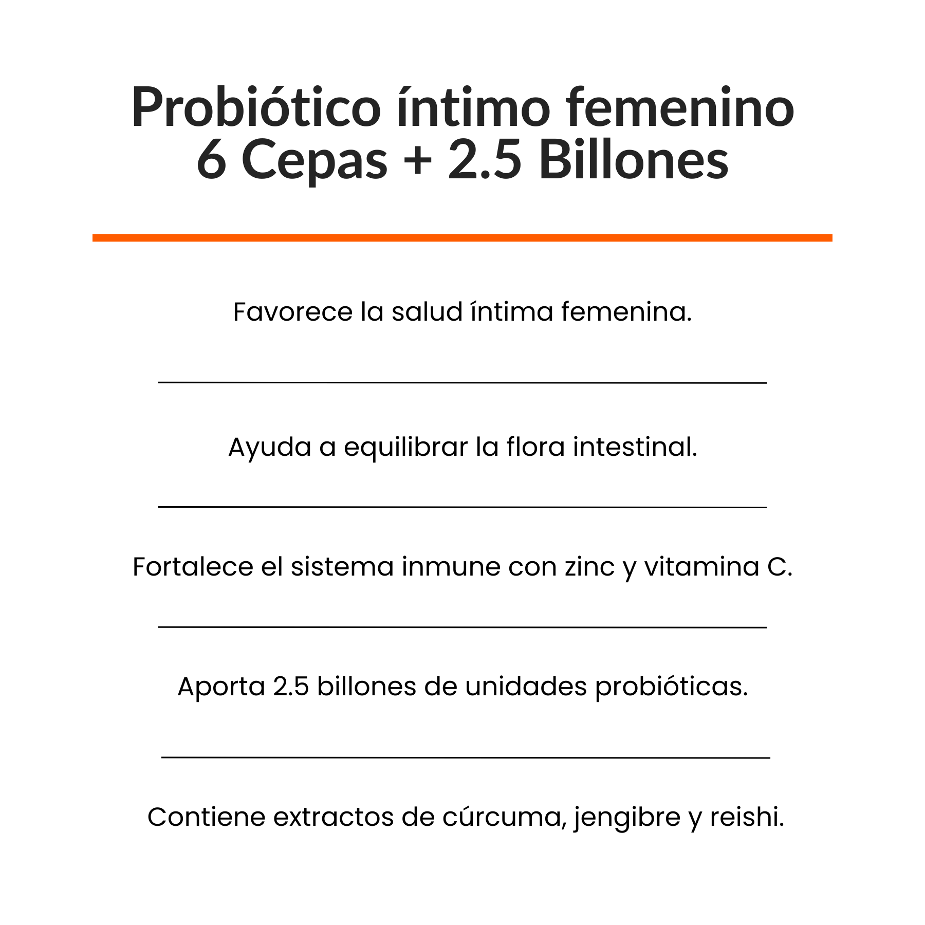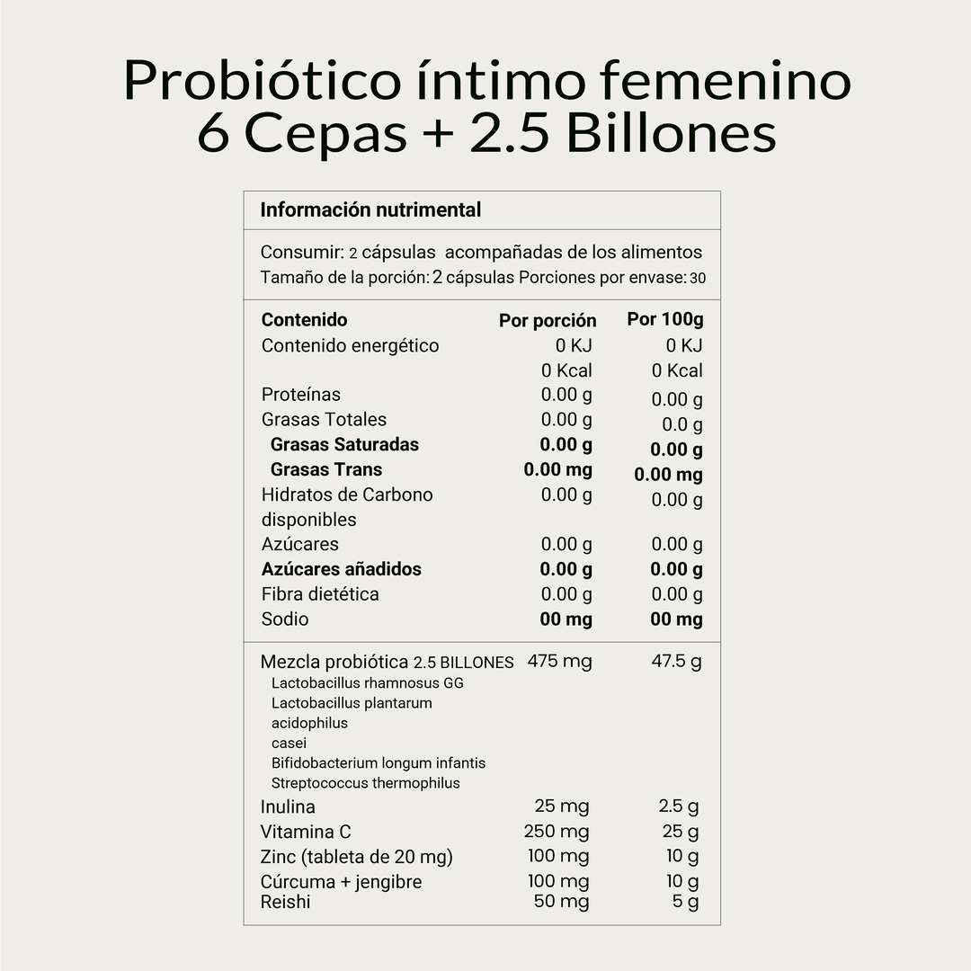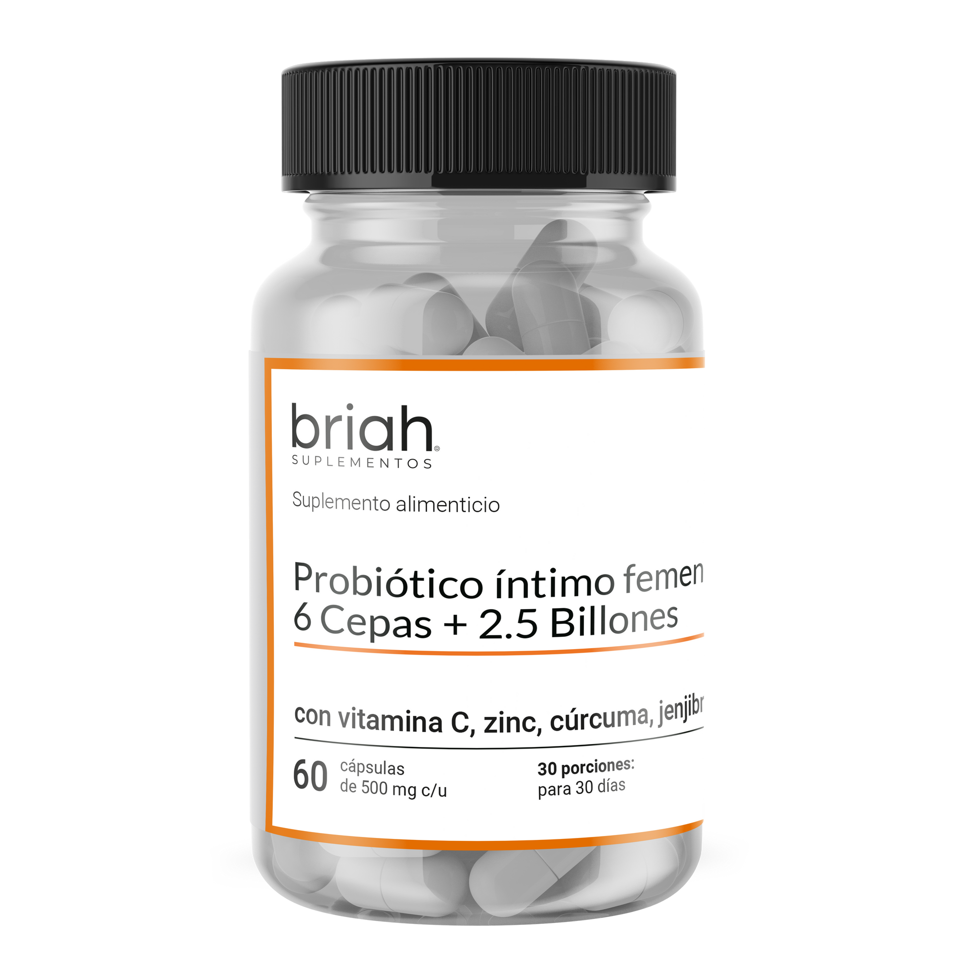 El Probiótico íntimo Briah es un complemento en cápsulas formulado para apoyar el equilibrio de la flora íntima femenina y acompañar el bienestar digestivo. Integra una mezcla probiótica de 6 cepas con 2.5 billones de UFC, inulina, vitamina C, zinc, y extractos de cúrcuma, jengibre y reishi, como parte de una rutina de bienestar femenino integral.