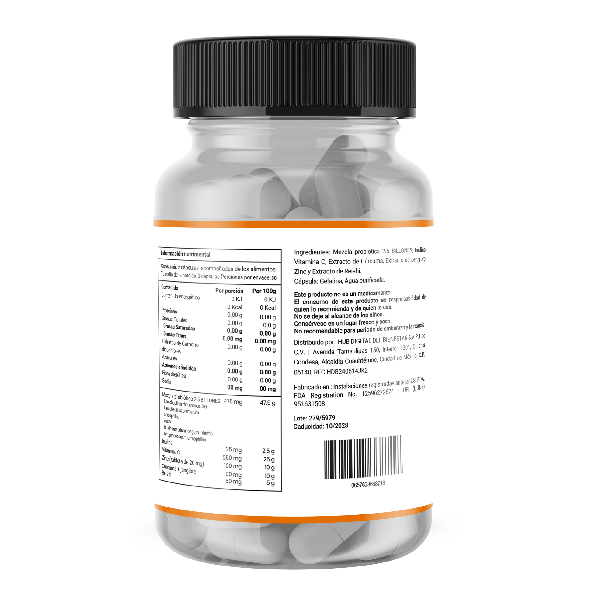 | Mezcla probiótica 6 cepas (2.5 billones UFC) Lactobacillus rhamnosus GG, L. plantarum, L. acidophilus, L. casei, Bifidobacterium longum infantis, Streptococcus thermophilus |