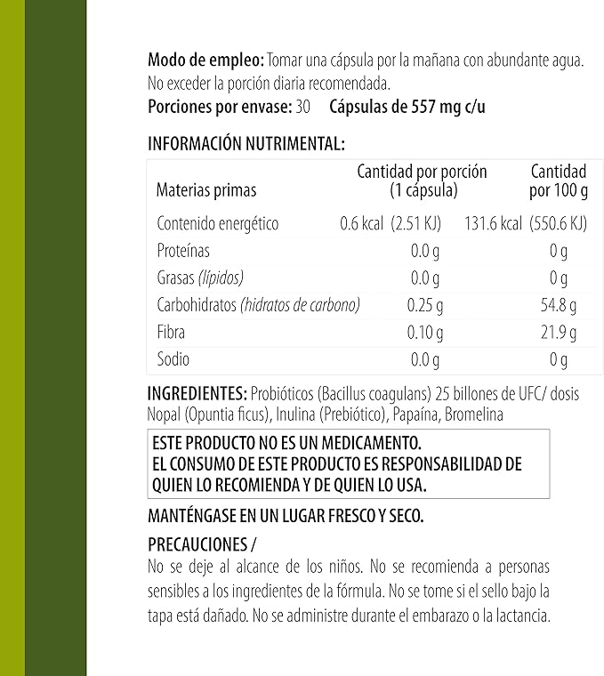 Otros ingredientes: Papaína, bromelina, nopal, cúrcuma, jengibre.