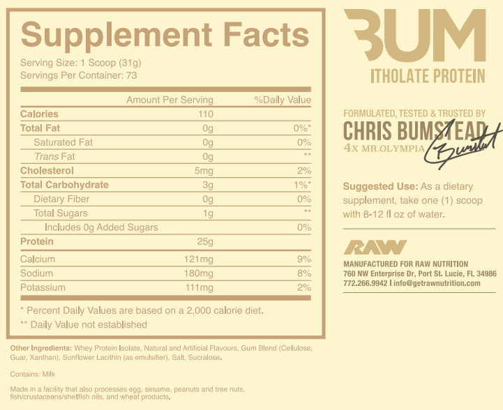 CBUM Itholate Protein es una proteína aislada de suero formulada por Raw Nutrition y respaldada por el atleta profesional Chris Bumstead. Esta fórmula de alta pureza ofrece una proteína limpia, baja en grasas y carbohidratos, ideal para complementar tu ingesta diaria sin exceder tus macros.