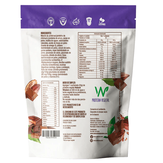 Proteína Vegetal con Probióticos, Enzimas, Omega 3 de Linaza, B12, Calcio y Magnesio 35g de Natural Wisdom | Fortalece el sistema inmune y apoya el al sistema digestivo | Polvo de 1820g Sabor Chocolate