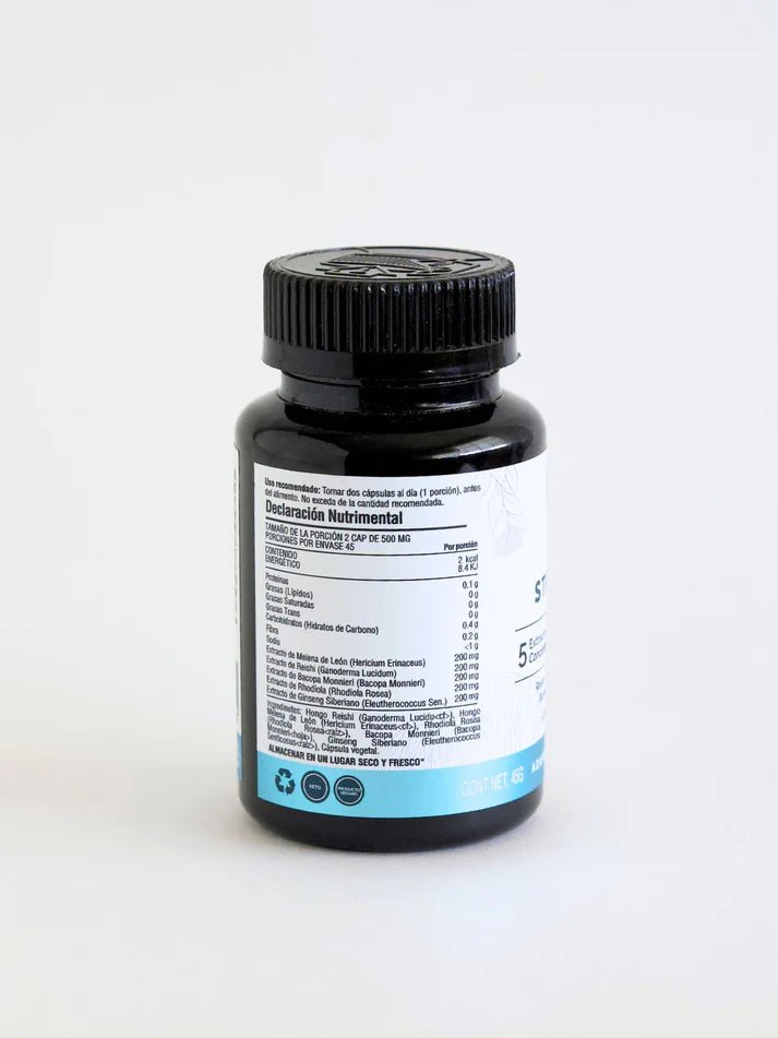 Su fórmula está diseñada para apoyar la claridad mental y la resistencia al estrés, con extractos naturales veganos, libres de gluten, soya y rellenos.