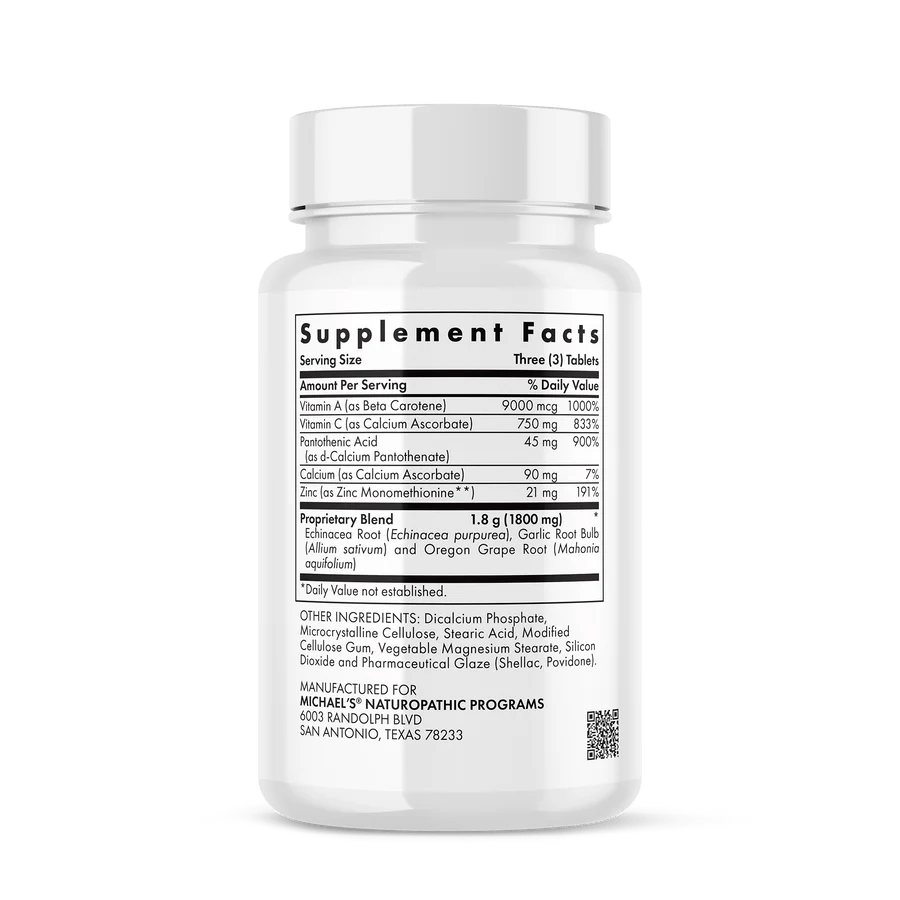 Quick Immune Response de Michael's Health es un suplemento diseñado para apoyar el sistema inmune mediante una combinación sinérgica de vitamina A, vitamina C, zinc y extractos herbales como equinácea, uva de Oregón y ajo. Presentado en tabletas vegetarianas, es ideal para personas que buscan fortalecer su organismo de manera natural.