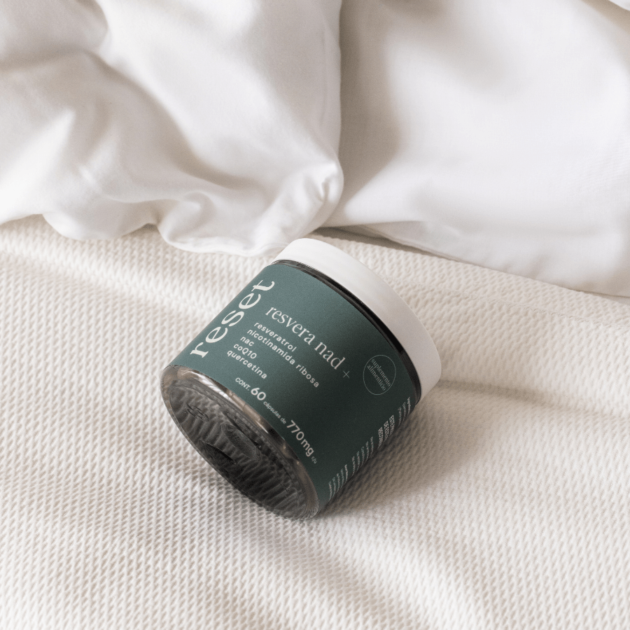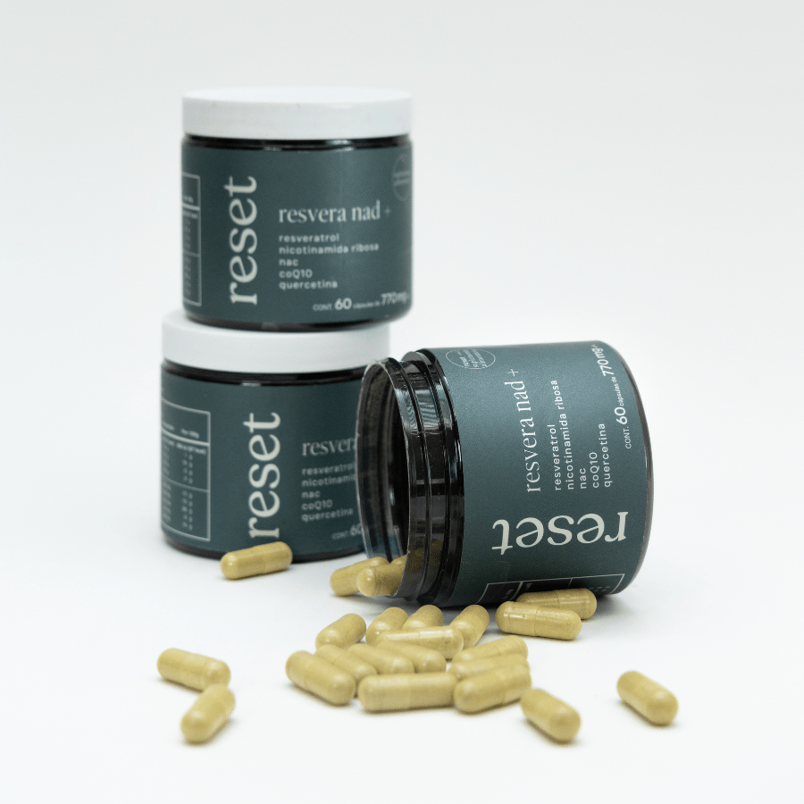 Resvera NAD+ Reset es un suplemento en cápsulas que combina potentes antioxidantes como resveratrol, quercetina, N-acetilcisteína (NAC), coenzima Q10 y nicotinamida ribosa. Su fórmula apoya la producción natural de energía celular y la protección contra radicales libres.