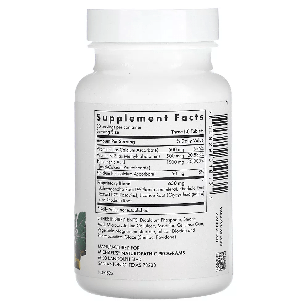 Rhodiola Rosea, Ashwagandha, Vitamina C, B12,B5, Calcio de Michael's Health | Apoya la respuesta al estrés y el equilibrio hormonal | 60 tabletas vegetarianas