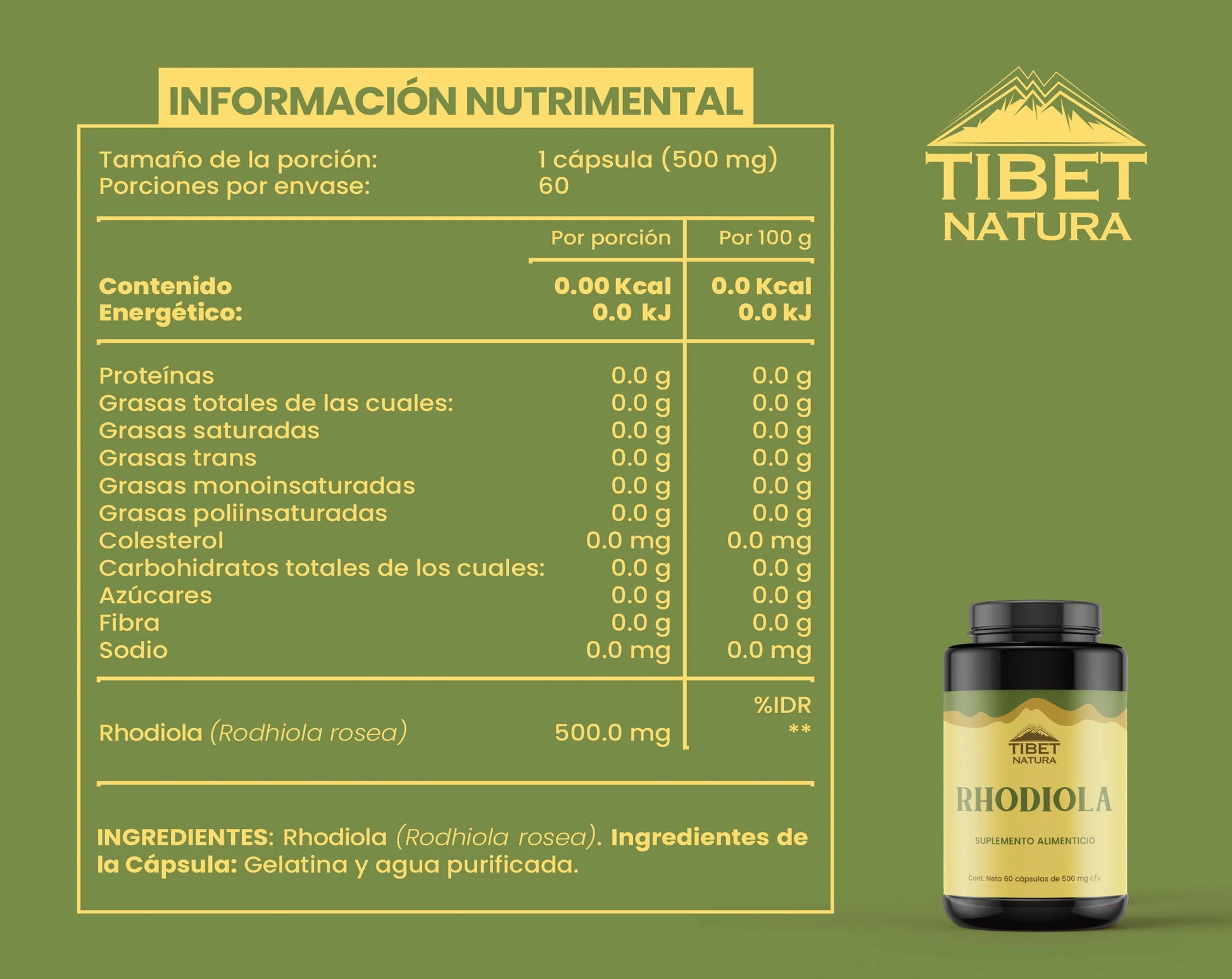 Rhodiola de Tibet Natura contiene 500 mg de raíz de Rhodiola rosea, una planta adaptógena tradicionalmente usada para mejorar el rendimiento físico, mental y la respuesta al estrés. Ideal para quienes buscan mayor energía, foco y bienestar.
