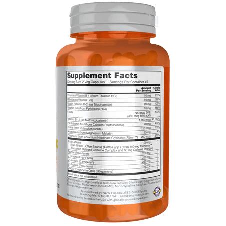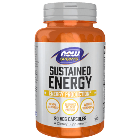 El Sustained Energy de NOW Sports combina cafeína de liberación prolongada, vitaminas del grupo B, magnesio, cromo y coenzima Q10 para brindar energía estable y apoyar el rendimiento físico y mental.