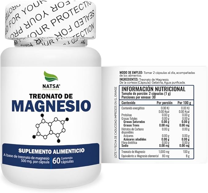 El treonato de magnesio NATSA es un suplemento diseñado para mejorar la concentración, el sueño y la memoria, gracias a su capacidad de llegar al cerebro. Ideal para adultos que buscan bienestar cognitivo.