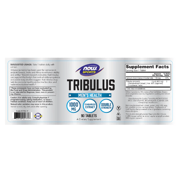 Tribulus terrestris 1,000 mg + Calcio 130 mg de NOW Sports | Extracto Estandarizado, Doble Fuerza | 90 tabletas