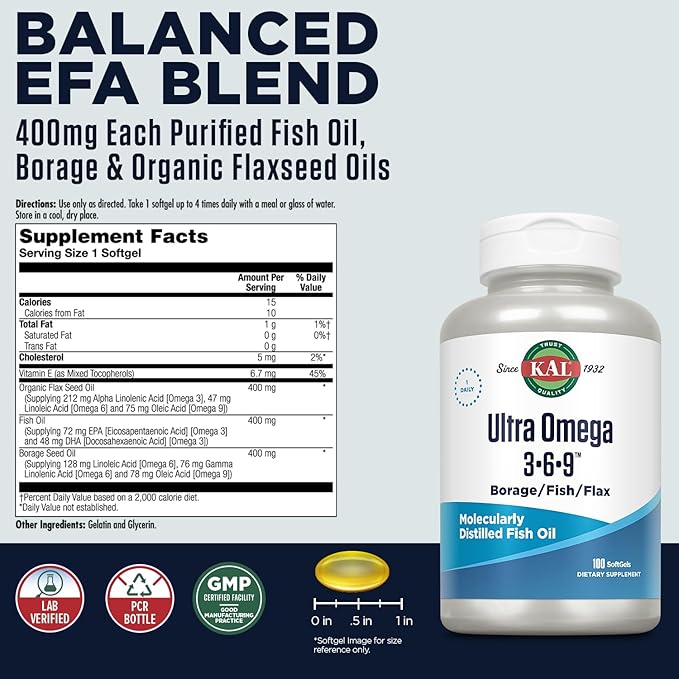 Ultra Omega 3-6-9 Borraja, Pescado y Linaza de KAL con Vitamina E | Sistema cardiovascular, colesterol, triglicéridos y función arterial | 50 cápsulas blandas