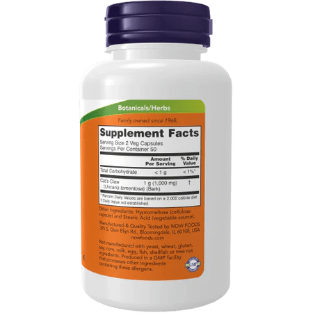 Uña de Gato de Now 500 mg | Equilibrio Inmunológico | 100 cápsulas veganas
