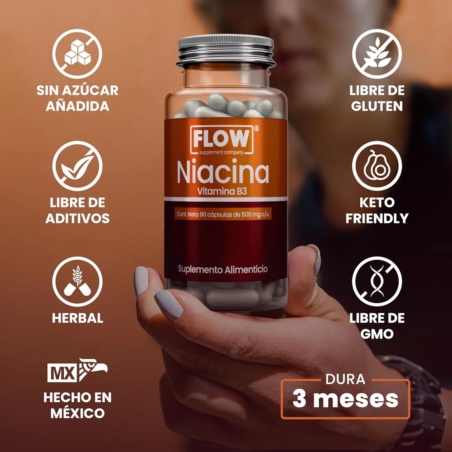 Vitamina B3 - Niacina 500mg de Flow Supplements | Apoya la función cardiovascular y metabólica, aumentando la energía | 90 cápsulas vegetales