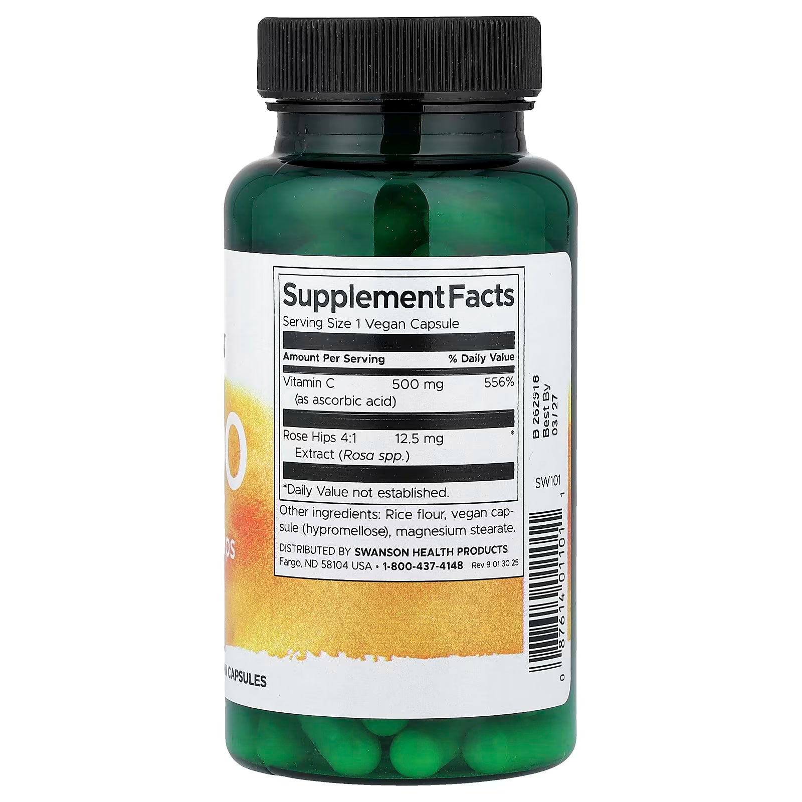 Vitamina C con rosa mosqueta 500mg de Swanson | Refuerza el sistema inmune, ayudando al cuerpo a defenderse contra enfermedades e infecciones | 100 cápsulas vegetales