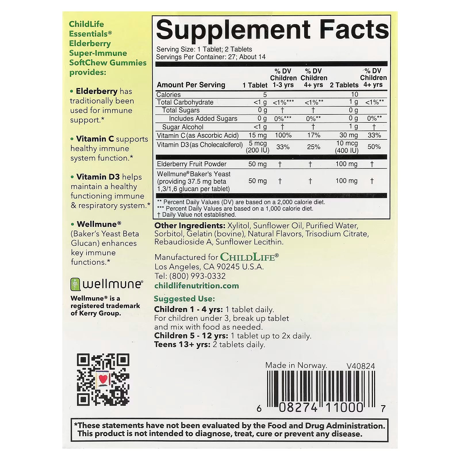 Es un suplemento en forma de tabletas masticables diseñado especialmente para niños, formulado con ingredientes clave como saúco, vitamina C y Wellmune® Baker's Yeast, que contribuyen al soporte del sistema inmunológico. Contiene una mezcla natural con sabor a bayas, sin azúcar ni sabores artificiales, ideal para niños de diferentes edades.