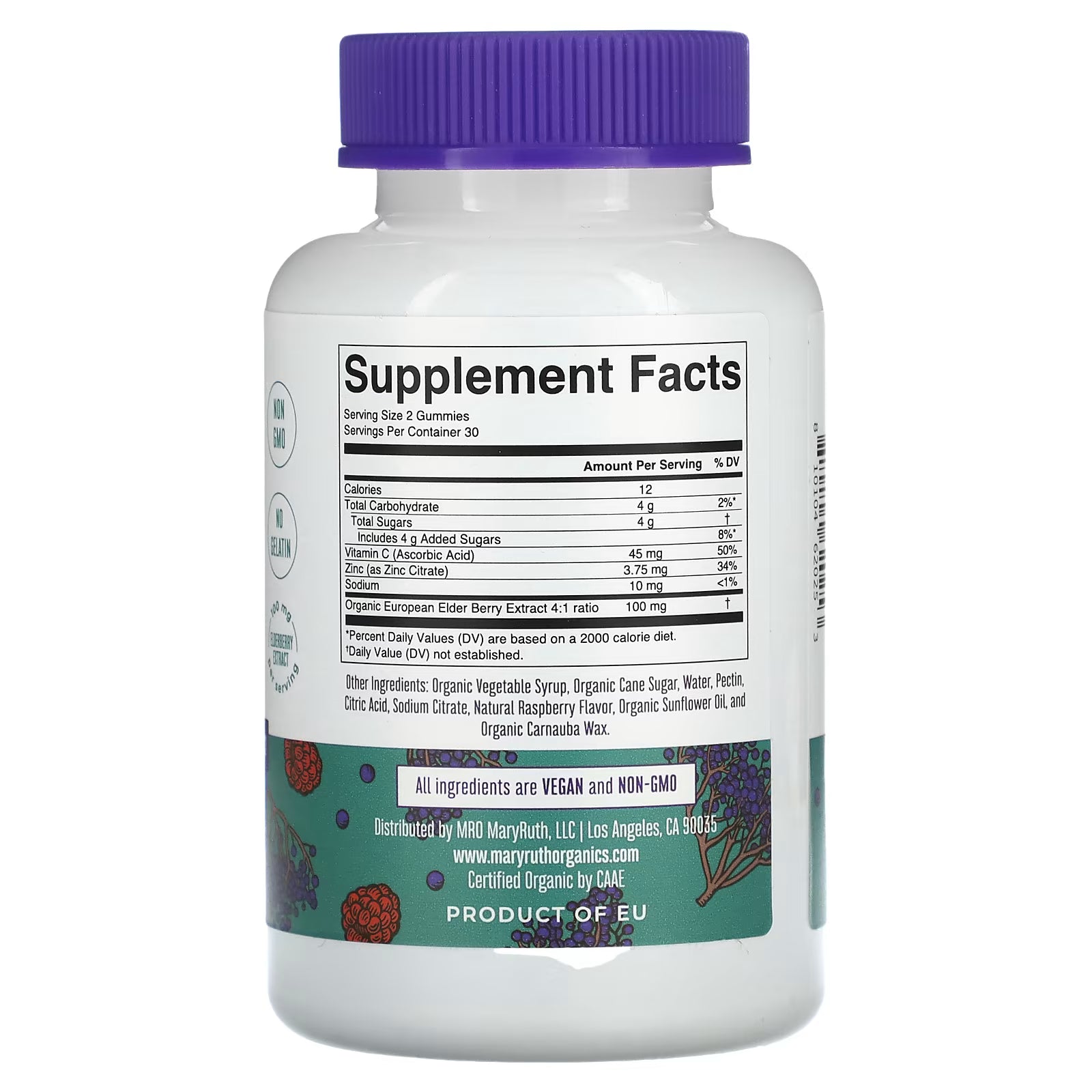 Vitamina C + Zinc con Extracto de baya de saúco Europeo Orgánico de Mary Ruth's | Antioxidantes y nutrientes que ayudan a proteger las células y apoyar la función respiratoria | 60 gomitas Sabor Bayas Mixtas