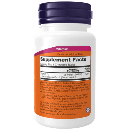 NOW Vitamin D-3 aporta 1,000 UI de vitamina D3 por tableta masticable, en un formato con sabor frutal natural que apoya el sistema óseo y el sistema inmune.