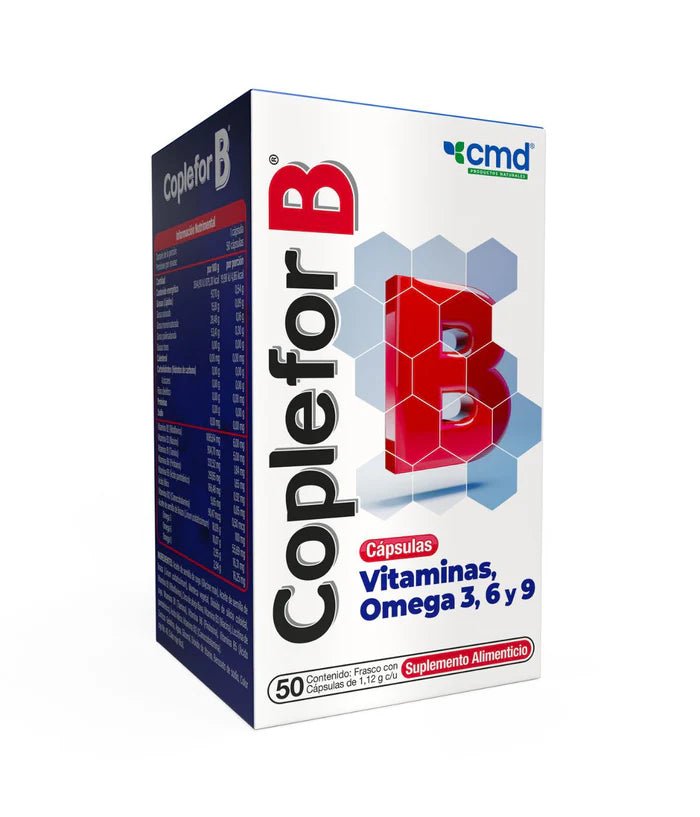 Coplefor B es un suplemento que combina el poder del complejo de vitaminas B con los beneficios de los Omega 3, 6 y 9, ofreciendo apoyo integral para el metabolismo, la función cerebral, la energía celular y la salud cardiovascular.