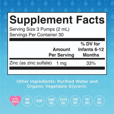 El Organic Infants Ionic Zinc Liquid Drops de MaryRuth’s es un suplemento líquido diseñado para bebés de 6-12 meses. Proporciona 1 mg de zinc por porción, apoyando la función inmunológica, el desarrollo celular y el crecimiento saludable.